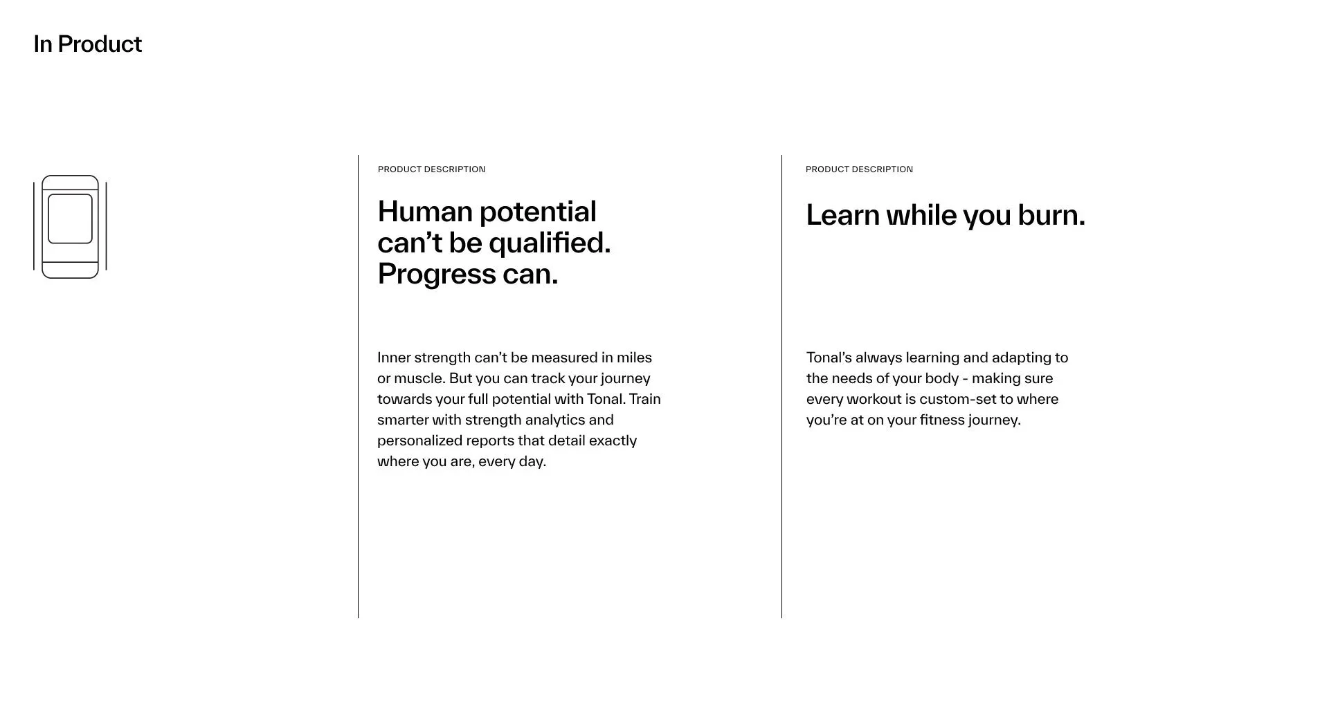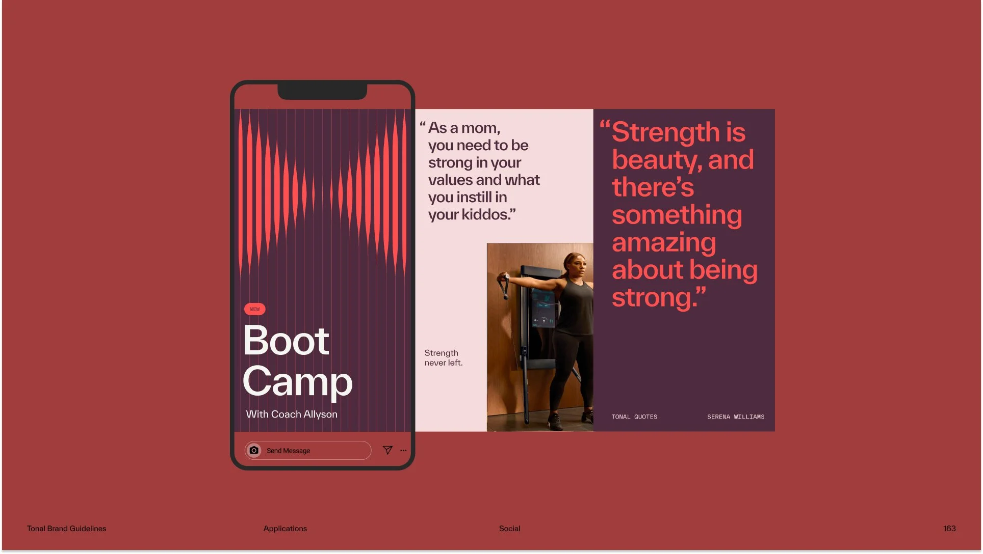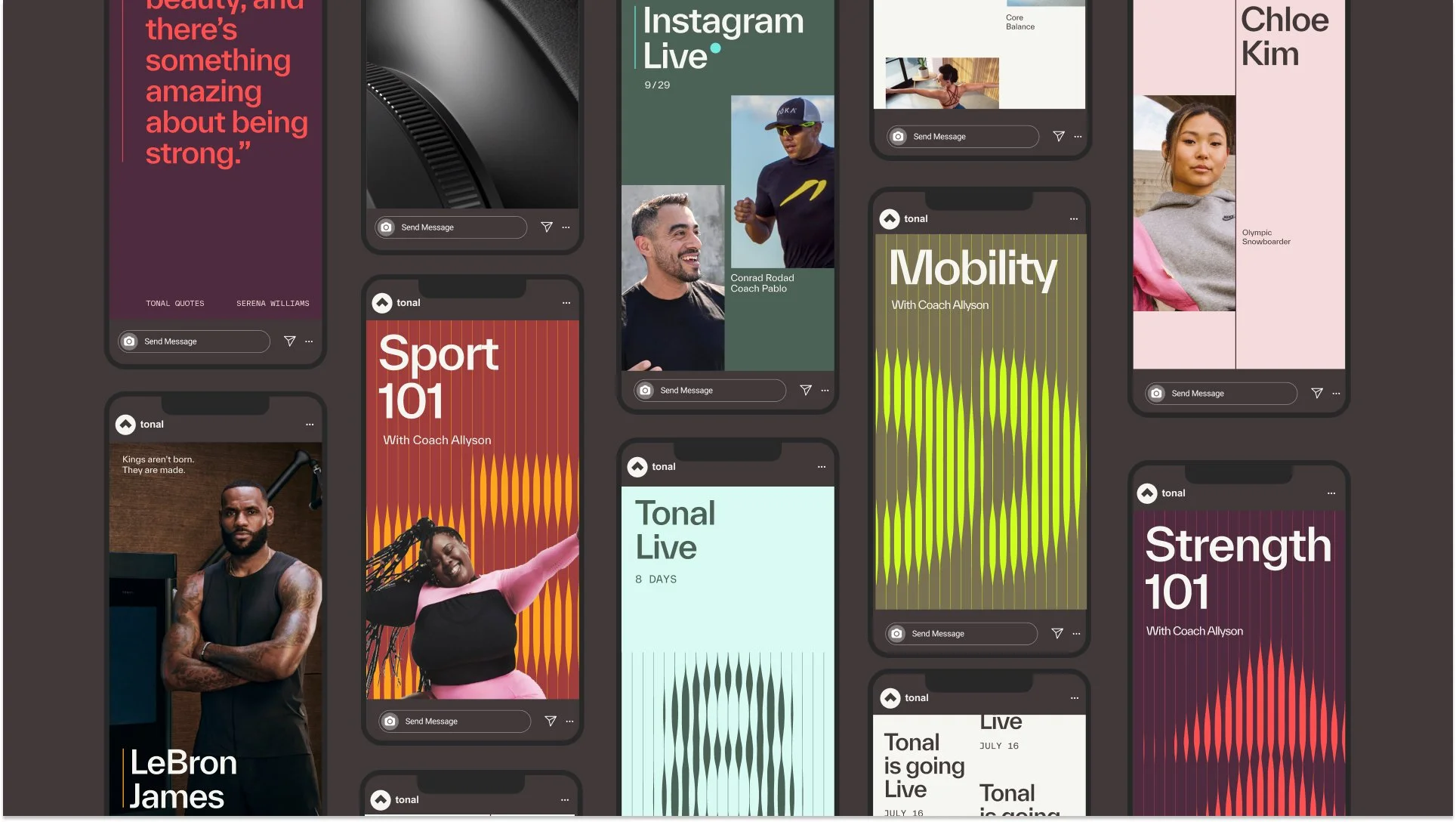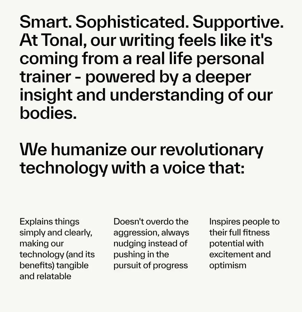 Tonal was designed to meet members in motion and intelligently guide them toward their greater potential. The brand voice is crafted to fuel members of all fitness levels with a tone tailored to feed their flywheel of growth, building them up to discover stronger versions of themselves.