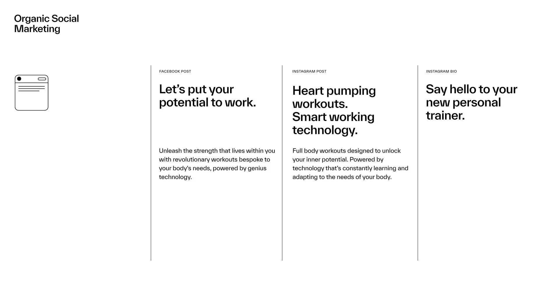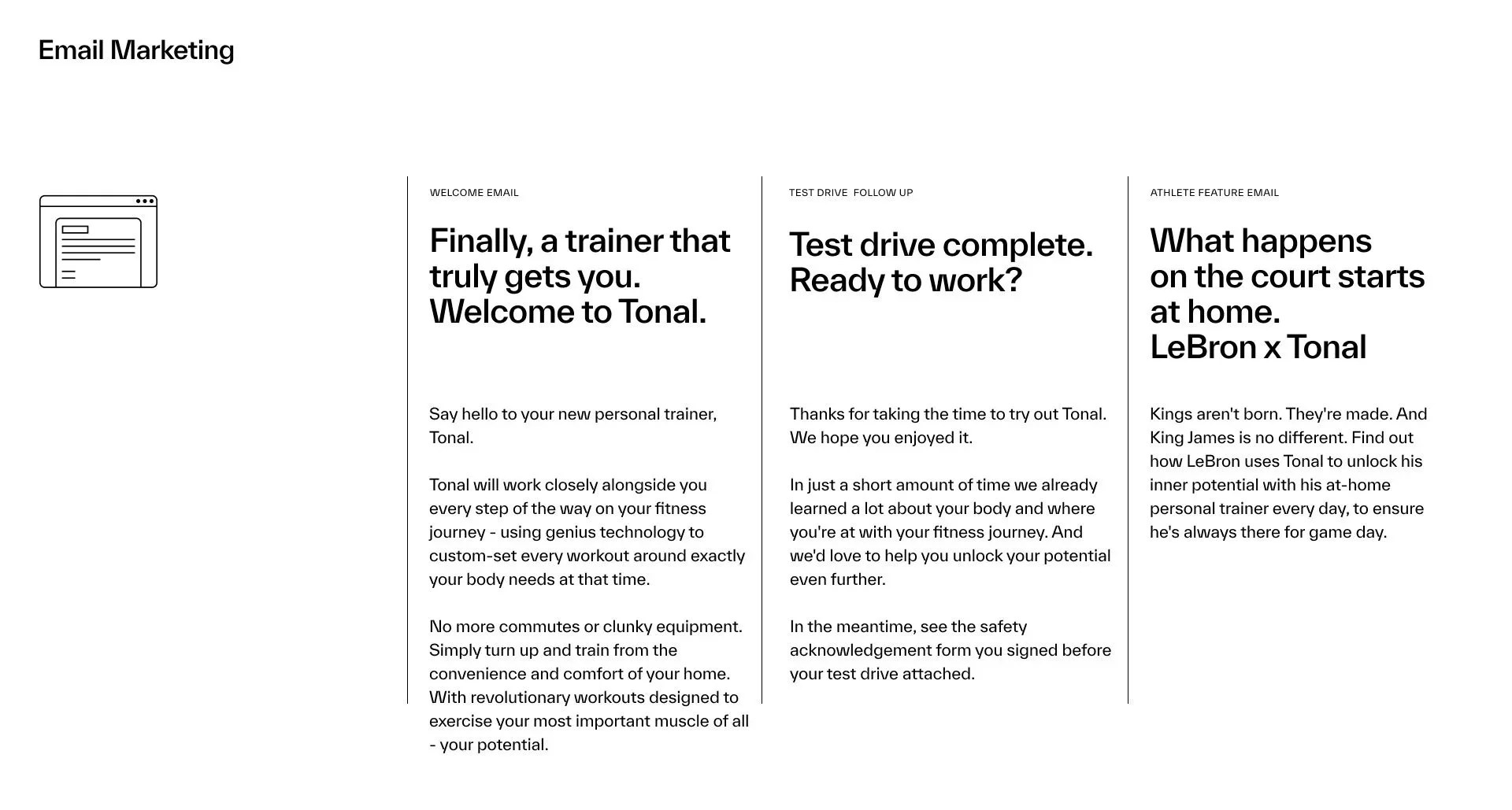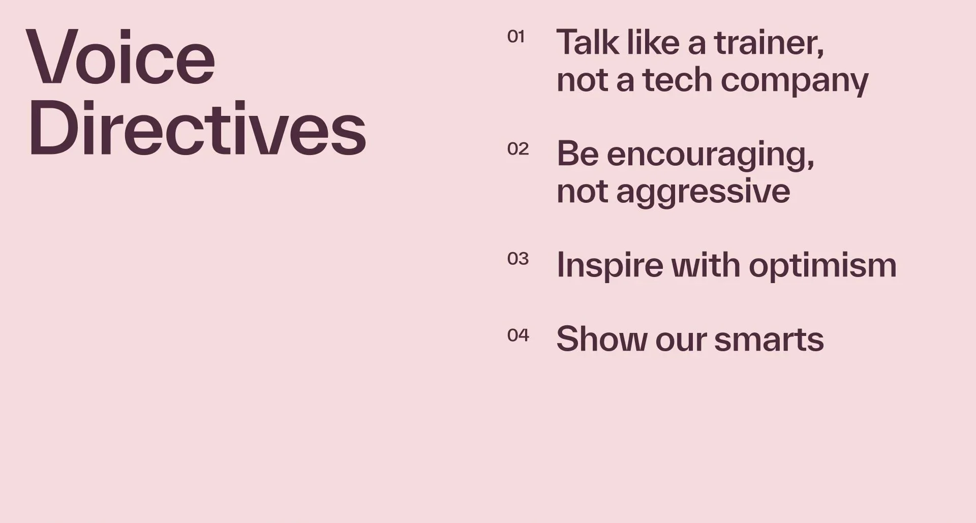 Tonal was designed to meet members in motion and intelligently guide them toward their greater potential. The brand voice is crafted to fuel members of all fitness levels with a tone tailored to feed their flywheel of growth, building them up to discover stronger versions of themselves.