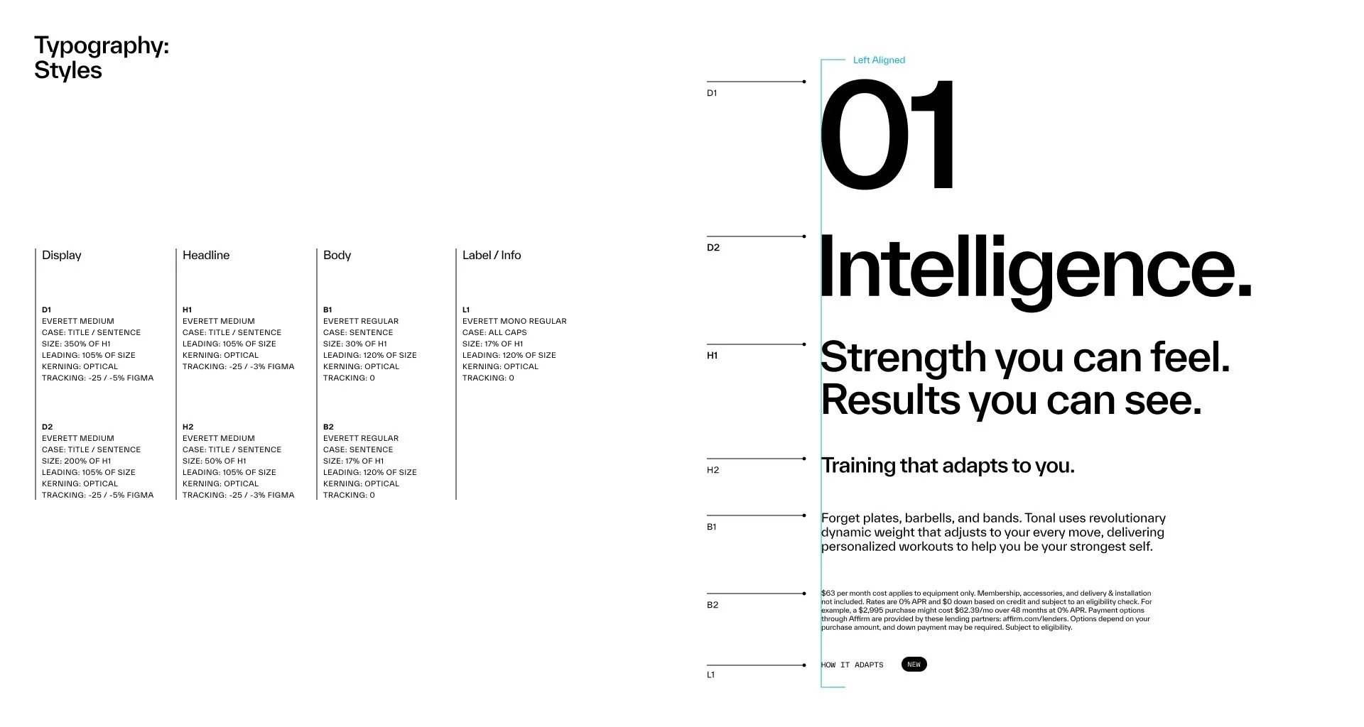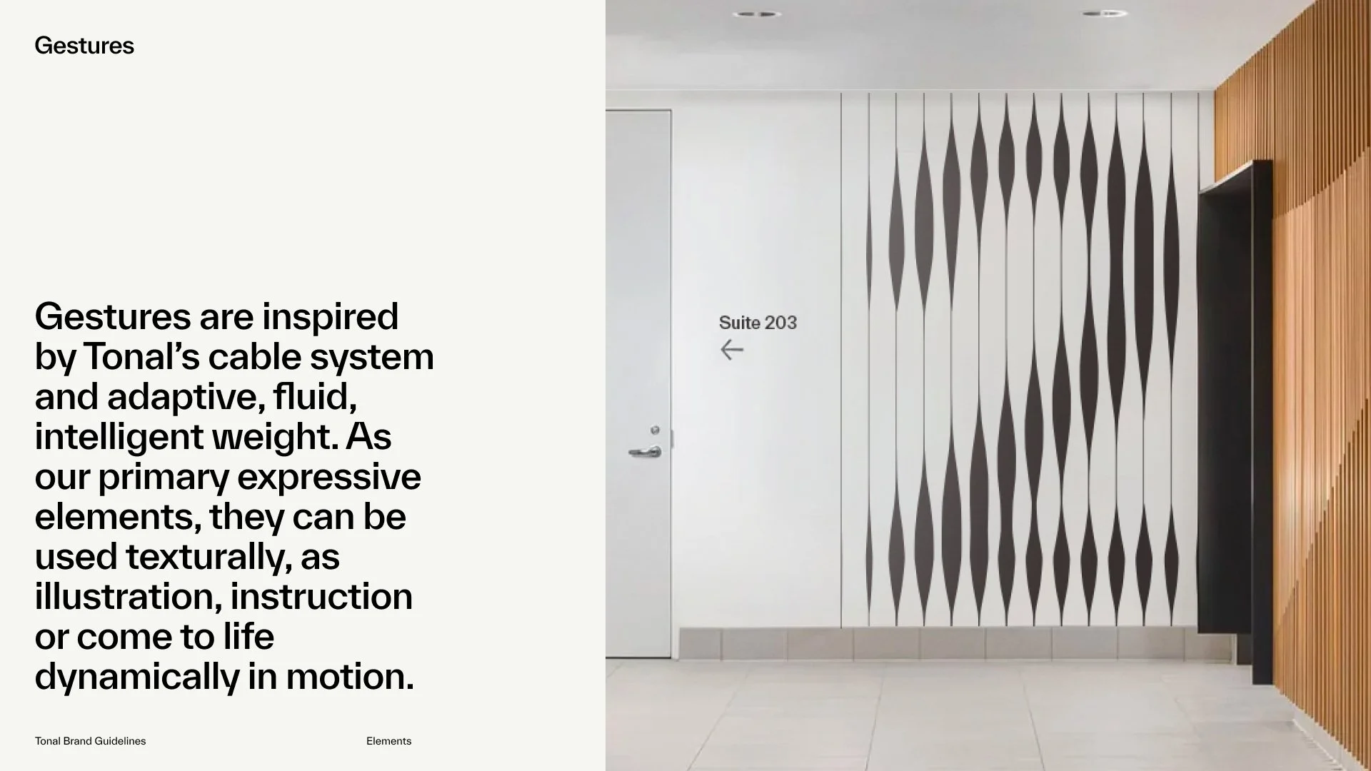 This identity system was born of two undeniable truths: First, that movement propels human potential. Secondly, that Tonal generates momentum - in every sense of the word. The brand, like its product and users, are in constant flow. Every stylistic element has been thoughtfully chosen to represent Tonal’s intelligence, precision and provide a dynamic structure that brings our brand identity to life.